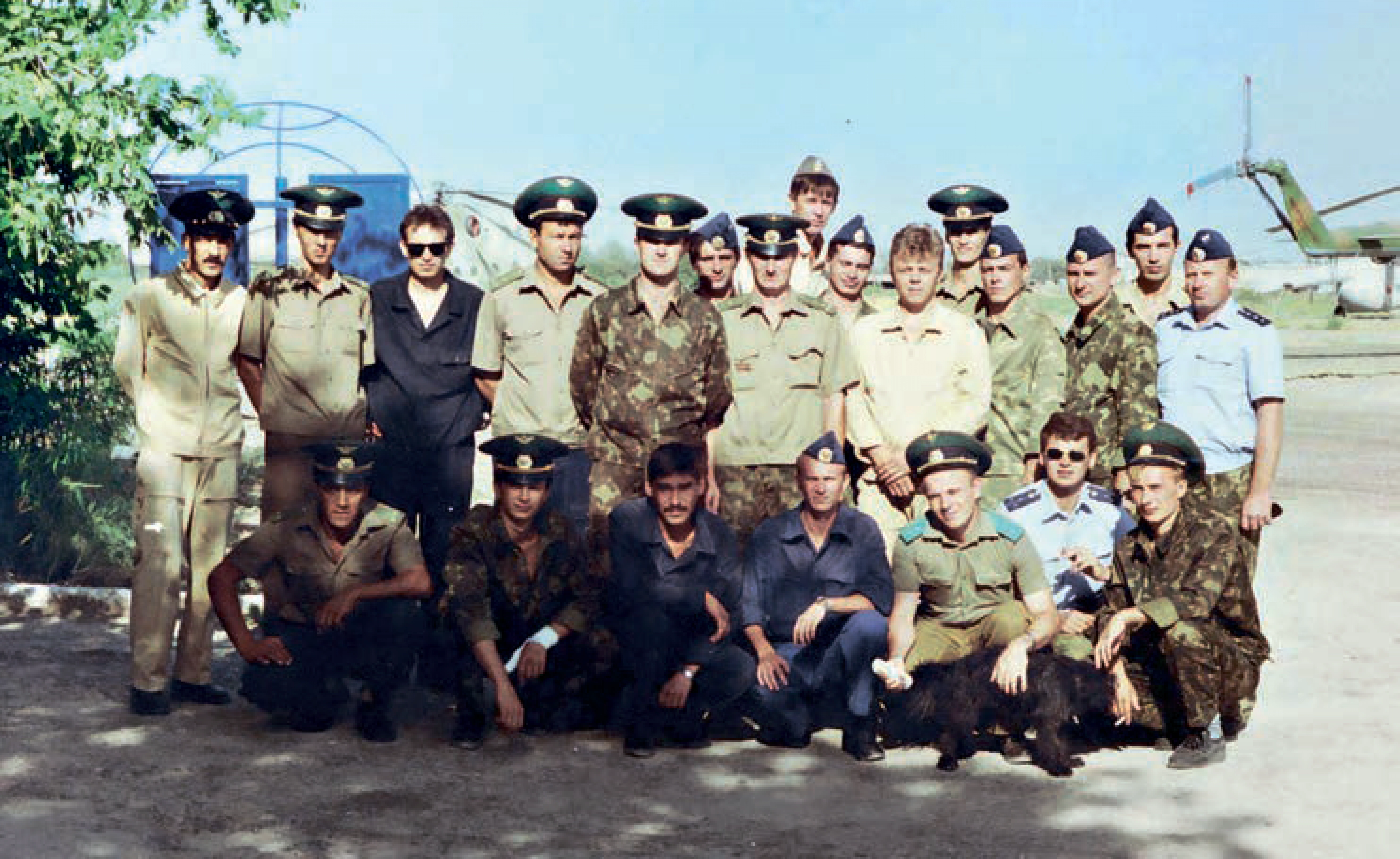 Руководство Марыйского полка. Слева направо сидят: начальник политотдела подполковник Ф. Валиулин, командир вертолета Ми-8 капитан В. Аллакуватов, командир полка подполковник Н. Романюк, командир звена вертолетов Ми-8 капитан Н. Керуков, старший инженер ИАС по ВД майор В. Киреев. Слева направо во втором ряду стоят: заместитель командира 1-й АЭ по летной подготовке майор В. Пикин, начальник группы АО капитан Метальников, начальник службы АТИ капитан Н. Бобкин, начальник штаба майор В. Рыкованов, командир 1-й АЭ майор В. Батаев.